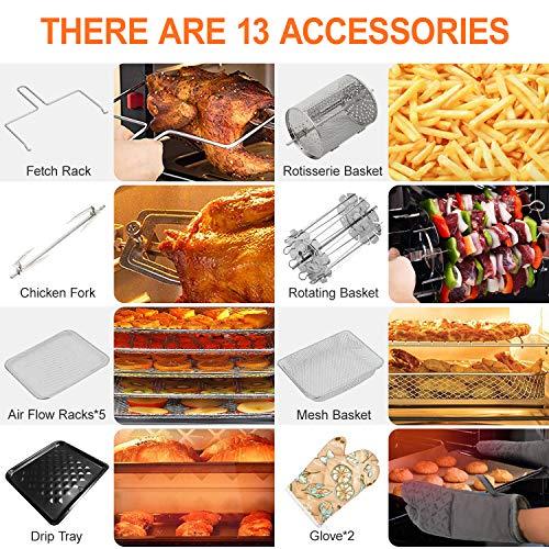 • šŸ•ć€Rich Accessories怑Comes with 13 accessories include: a skewer rotisserie, fry net basket, roating basket, drip tray, fetch rack, chicken fork, 5pcs dehydrating racks, 2pcs oven mitts, Removable drip tray and dishwasher safe parts make cleaning a breeze.