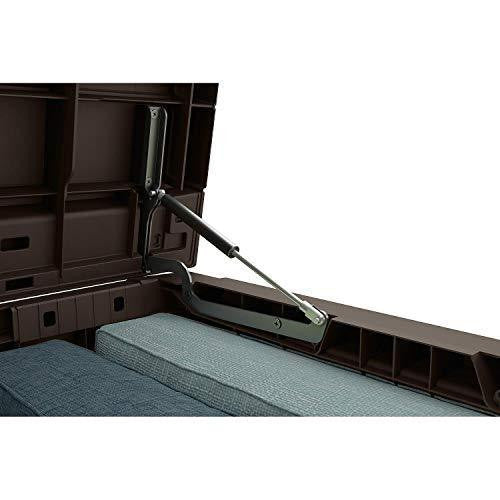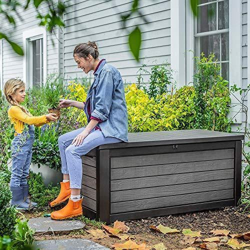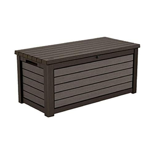 Details: Are your kids' toys taking over the yard? Does your patio or deck need extra seating? The attractive, multifunctional design of Keter's 165-Gallon Deck Box makes it the perfect outdoor storage solution and much more. Besides keeping garden tools, outdoor cushions, sporting equipment or pool accessories organized, it serves as a beautiful, practical addition that optimizes outdoor living space and blends seamlessly with your decor. When closed, the durable wood-look plastic deck box keeps contents safe, dry and ventilated while it doubles as a table, a work space, or a seating spot large enough for two adults. With a spacious interior, you'll have plenty of room for storing even large and cumbersome objects like cushion, pool floats and equipment, outdoor tools and more. Designed for superior durability and weather-resistance, this box won't rust, peel or dent. Constructed from polypropylene resin, a nontoxic, recyclable plastic material, it has less negative impact on the environment. Easy to assemble.