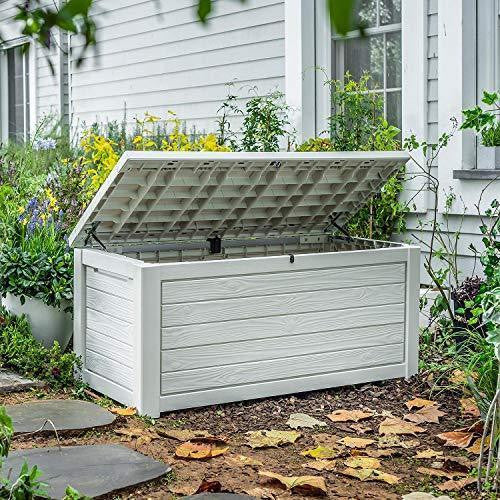 Details: Are your kids' toys taking over the yard? Does your patio or deck need extra seating? The attractive, multifunctional design of Keter's 165-Gallon Deck Box makes it the perfect outdoor storage solution and much more. Besides keeping garden tools, outdoor cushions, sporting equipment or pool accessories organized, it serves as a beautiful, practical addition that optimizes outdoor living space and blends seamlessly with your decor. When closed, the durable wood-look plastic deck box keeps contents safe, dry and ventilated while it doubles as a table, a work space, or a seating spot large enough for two adults. With a spacious interior, you'll have plenty of room for storing even large and cumbersome objects like cushion, pool floats and equipment, outdoor tools and more. Designed for superior durability and weather-resistance, this box won't rust, peel or dent. Constructed from polypropylene resin, a nontoxic, recyclable plastic material, it has less negative impact on the environment. Easy to assemble.