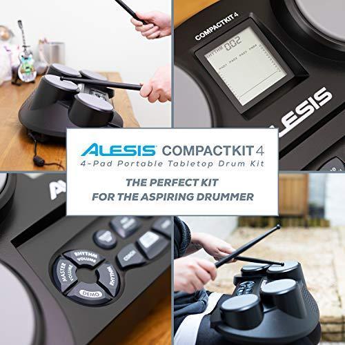 Alesis Compact Kit 4 – Tabletop Electric Drum Set with 70 Electronic / Acoustic Drum Kit Sounds, 4 Pads, Battery- or AC-Power and Drum Sticks Included