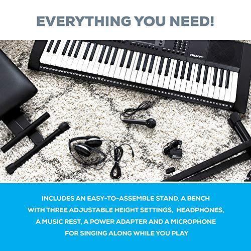 • Everything you Need - Includes an easy-to-assemble stand, a bench with 3 adjustable height settings, headphones, a music rest, a power adapter and a microphone for singing along while you play