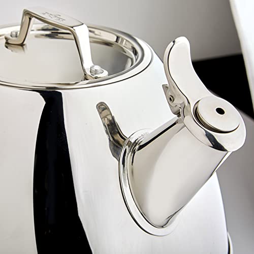 Details: The All-Clad 2-Quart Tea Kettle quickly and efficiently boils water. Made from durable, high quality 18/10 stainless steel with a high-polished surface for easy cleaning. Whistles to alert when water is boiling, and hinged cap flips open for easy pouring. Comfortable, sloped handle is securely attached with stainless steel rivets. Compatible on all cooktops including gas, electric, ceramic, and induction.