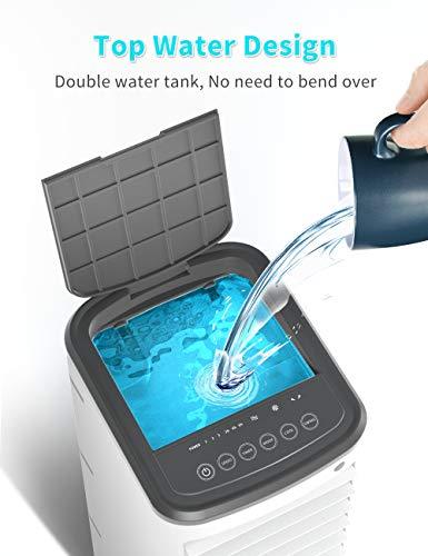 - ❄【Humanized Double Watertank, Ultimate Comfy】 No need to bend over with the topwater tank! It is friendly to the elderly and pregnant women. Press the ‘COOL’ button for powerful cool, loading it up with ice cubes and ice packs for best use! The smart sleep mode provides a comfortable climate at alternating speeds, making it healthier to enjoy all-night sleep with a 12-hour timer setting, and you don't have to refill the unit in a good 8 hr run. Feel refreshed and take on a new day!
