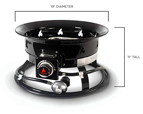 - Complete fire pit kit: Includes pre-attached 10-ft hose to keep your standard 20-lb propane tank cylinder (not included) safely out of sight, fully adjustable regulator with chrome valve knob for varying flame height, and 4.4-lb natural lava rock set designed to enhance flickering effect. Optional accessories of CSA approved natural gas conversion kit 780, cover & carry kit 730, and standard carry bag 760 available separately.