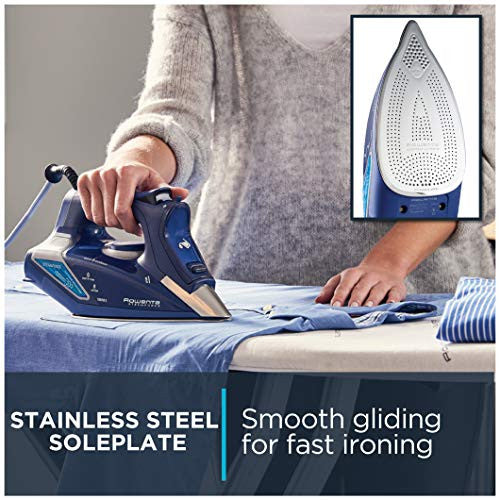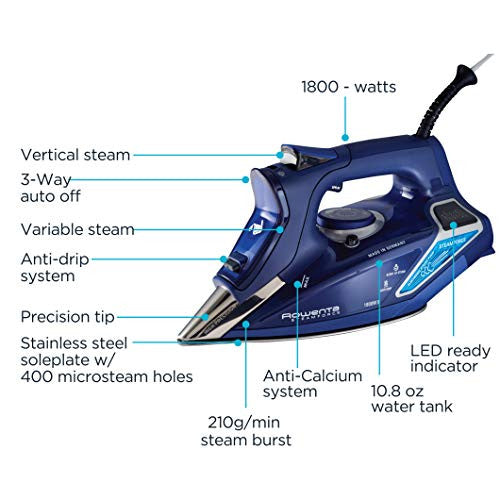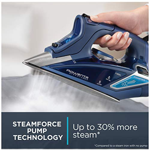 Details: For powerful steam and professional-quality results, turn to the Rowenta DW9280 SteamForce steam iron. The handheld iron’s integrated electronic steam pump delivers a substantial burst of vertical steam (up to 210g) and pushes up to 30% more steam into material (compared to steam irons with no pump), ensuring fast, effective removal of wrinkles from all types of fabrics. A handy LED digital display illuminates for linen, cotton, wool, silk, or nylon to indicate when the soleplate has reached the appropriate temperature for the selected fabric. The iron’s Microsteam stainless-steel soleplate provides 400 steam holes for even steam distribution and includes an ultra-thin silicate coating for scratch-resistant strength and nonstick gliding to protect even the most delicate of fabrics. A smart steam motion sensor turns off variable steam when the iron stops moving, conserving water and electricity. Even more, the iron’s precision tip makes easy work of maneuvering over collars, along seams, and in between buttons, and the precision-shot function allows for a concentrated shot of steam at the top of the soleplate tip. For safety and peace of mind, the iron shuts off automatically after 8 minutes if left unused in the upright position and after 30 seconds if tipped over or left in the horizontal position. Other highlights include one-touch controls, a cool spray mist for extra-stubborn wrinkles, an integrated anti-calcium system, and a self-clean system for long-lasting performance. From household linens to personal wardrobes, make a good impression with help from the Rowenta SteamForce steam iron. The anti-drip system helps prevent spitting and leaking when thermostat is on a low setting.
