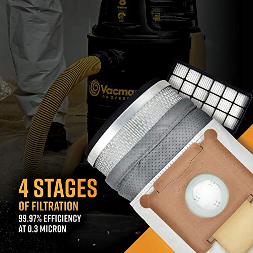 Details: The Vacmaster professional 8 gallon wet/dry vac is a certified HEPA system & has an ultra Quiet 2-stage industrial motor. It features 4 levels of filtration including a HEPA Cartridge filter, microfiber pre-filter, high-efficiency fine dust filter bag with closure flap, & an exhaust filter-alll for hepa compliance. To qualify as a HEPA system, a unit must capture & retain 99.97% of all contaminants down to 0.3 micron in Particle size. In independent tests, the Vacmaster professional VK811PH showed an efficiency of 99.996% in the 0.3 micron particle size range, meeting & exceeding the HEPA efficiency requirements set by the United States environmental protection Agency (EPA) & required under the renovation, repair, & painting (RRP) program.